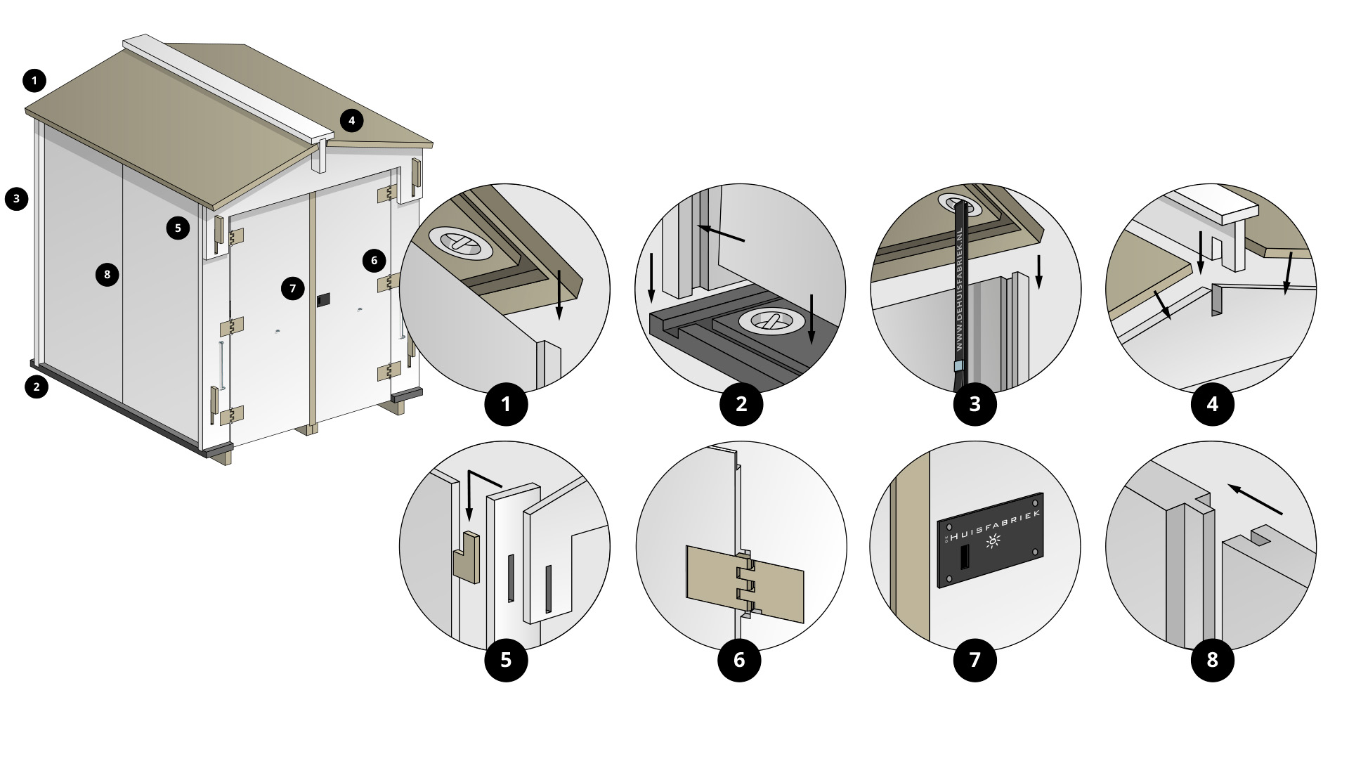 Illustraties voor de website van De Huiskabriek. Het huisfabriek concept bestaat uit eenvoudig op te bouwen en af te breken strandhuisjes. Voor strand, zwembad, tuin, festivals, dakterras, fairs, stadsstrand, koek & zopie,